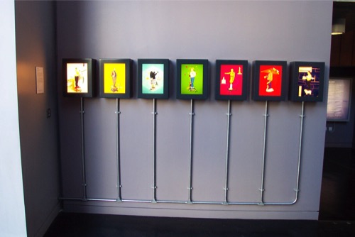 The concept for the work was based on an adaptation of the external lighting colour scheme, one of the recurrent motifs of the building. This uses a sequence of colours based on the television test pattern and is used here as a backdrop to a series of portraits of people involved with aspects of the life of the building. The portraits use stylised and allegorical imagery based on 17th century Mughal portraiture. The final works were reproduced as high quality transparencies for lightbox display within the building, providing 7 small intensely coloured moments within the muted palette of the building.