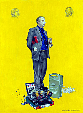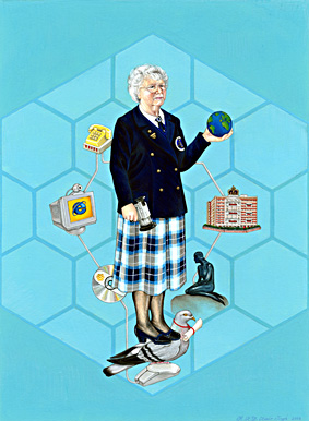 Animal/Insect: Pigeon. As one of the earliest forms of communication across distances this symbolises not only the main theme of the portrait but also how far communication technology has come. Hence, the pigeon stands on a technological animal‚ - the computer mouse. This static communication‚ of the mouse is contrasted with the kinetic communication of the pigeon that has