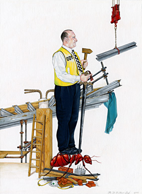 Wearing: Hi Viz vest (an object chosen by Billy), hard Hat with first aid cross symbolising Billy's role of overseeing safety on site.