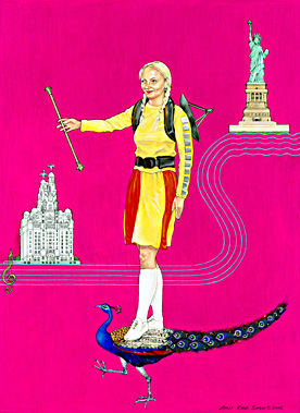 Animal/Insect: Peacock. The emblem of wisdom, music and poetry in Indian mythology and therefore fits in with the theme of the music- based project which uses songs, written by girl bands in Liverpool. Also, the peacock is famous for its dance in which it parades its feathers. Its performance is both colourful and has an air of showmanship about it - qualities that are particularly associated with brass band acts and marching troupes.