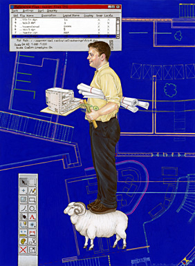 Other: The background shows the architect plans of the FACT Centre on a computer screen. Particularly highlighted is the floating tool box‚ which serves to contrast the sophisticated design tools used by architects today with those equivalents used in the past (as held by Jamie) - a reminder of modern day advancements in design technology.