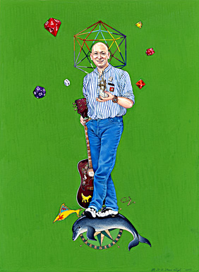 Other: Shark (swimming beside dolphin) - reproduces the shark on a Frank Zappa lapel pin owned by Roy. Symbol of Roy's particularly keen interest in Zappa's music. Geometric Diagram (an icosahedron), a shape that represents one of the many 3D geometric structures that Roy made. Placed behind Roy's head this serves as a halo/nimbus - traditional symbol used to denote someone who has passed away but also symbol of respect for a person (living or deceased).